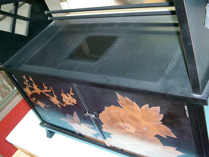 昭和53年にお買い上げいただいた飾棚ですが、直射日光の影響でかなり、くすみ・汚れ・くもりがありました。磨きをかけましたら見事に牡丹の蒔絵が甦りました。白い汚れ・くもりも無くなり艶が戻りました。