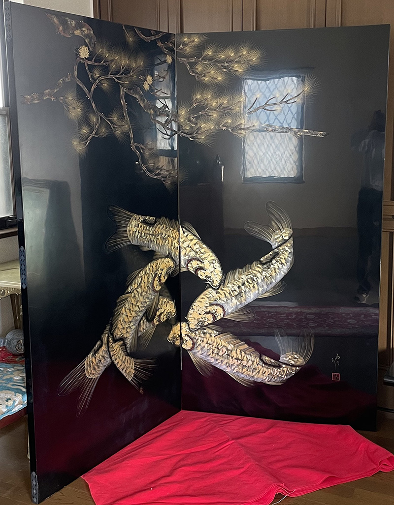 昭和55年にお買い上げいただいた屏風ですが、全体的にくもり・くすみが見られました。磨きをかけましたら艶が戻り、鯉の絵柄が浮き立ちました。裏面は冷暖房の影響でかなり劣化がしていましたので、塗り直しを行いました。