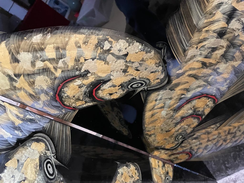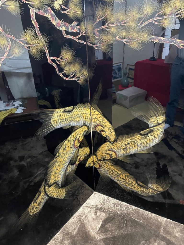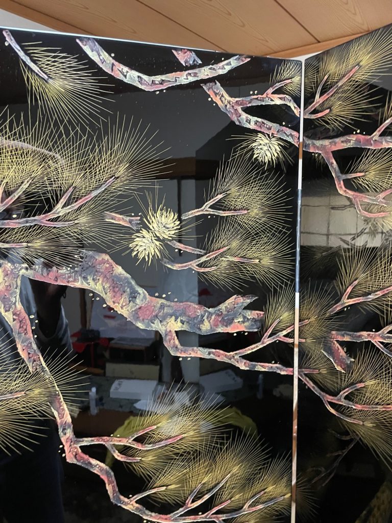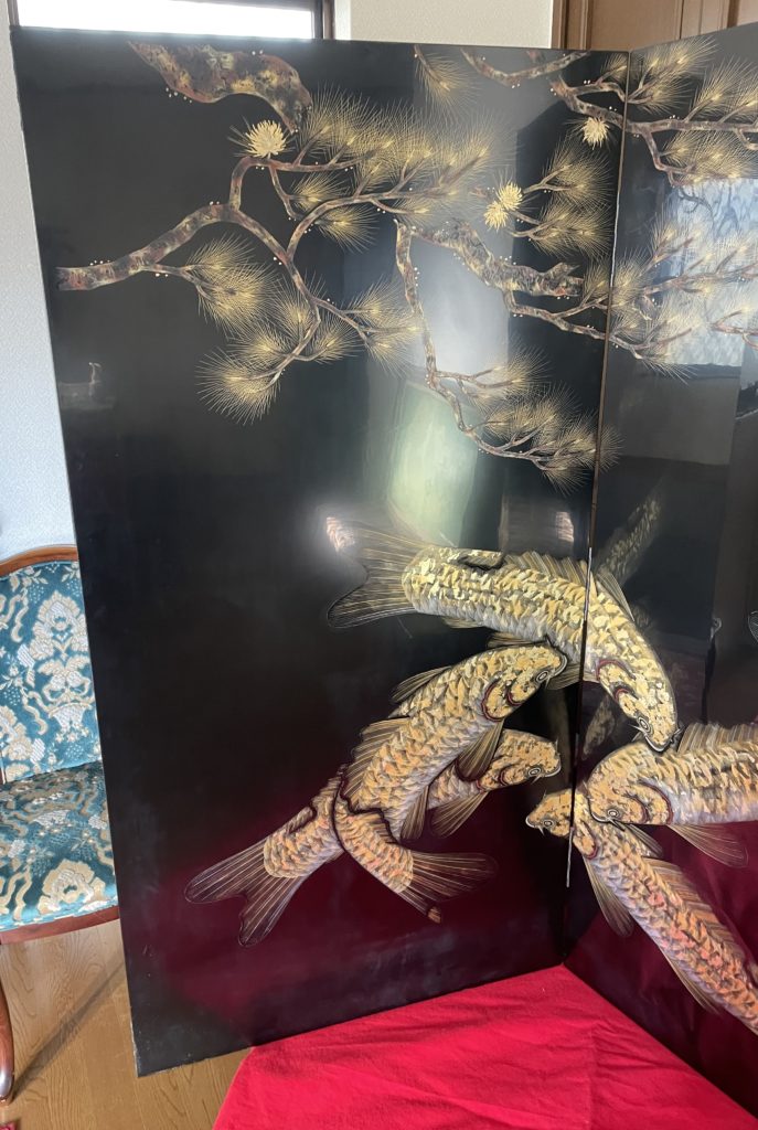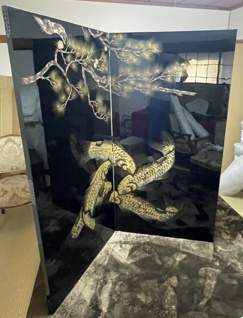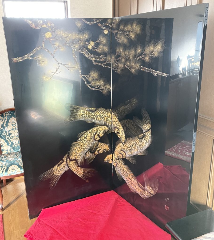 鹿児島県S様から、昭和55年にお買い上げいただいた屏風の修理をご依頼いただきました。全体的にくもり・くすみが見られ、磨きをかけましたら艶が戻り、鯉の絵柄が浮き立ちました。裏面は冷暖房の影響でかなり劣化がしていましたので、塗り直しを行いました。
