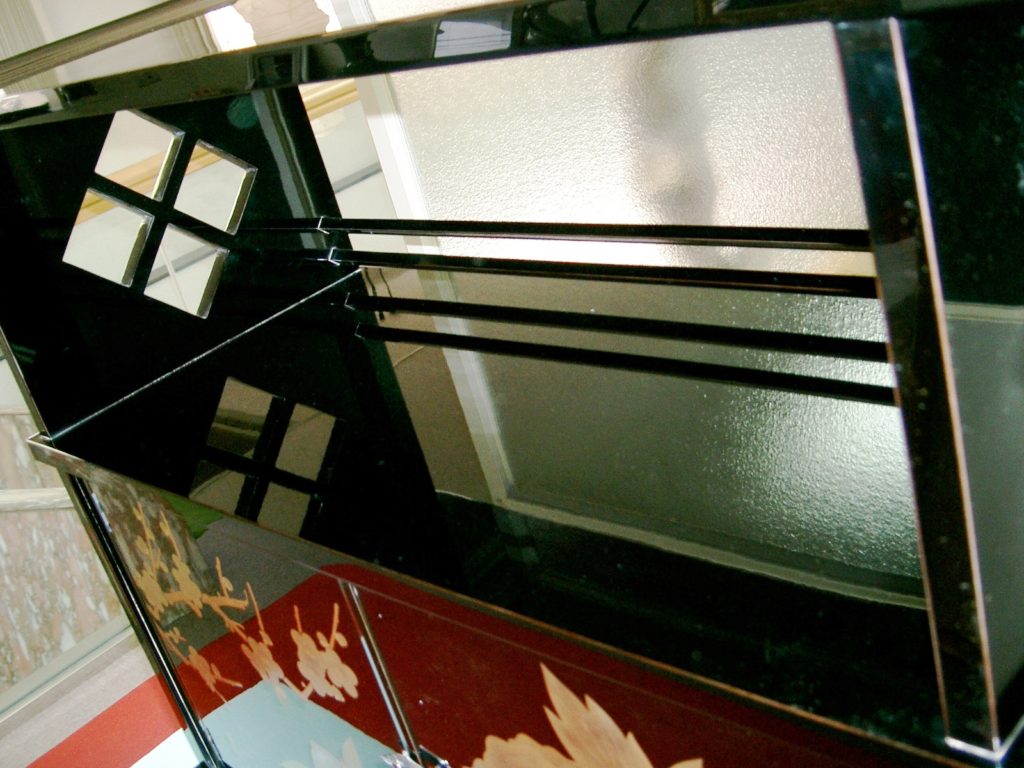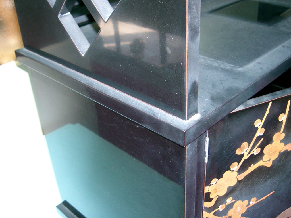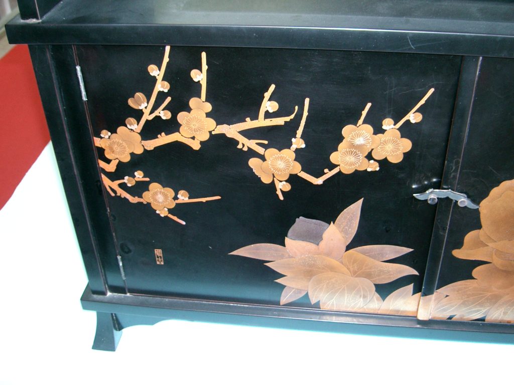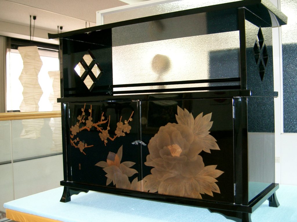 三重県K様から飾棚の修理をご依頼いただきました。昭和53年にお買い上げいただいた飾棚ですが、直射日光の影響でかなり、くすみ・汚れ・くもりがありました。磨きをかけましたら見事に牡丹の蒔絵が甦りました。白い汚れ・くもりも無くなり艶が戻りました。