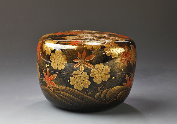 春秋の桜や紅葉が繊細でいて華やかな蒔絵で描かれた、どこかモダンな雰囲気が感じられる棗になります。